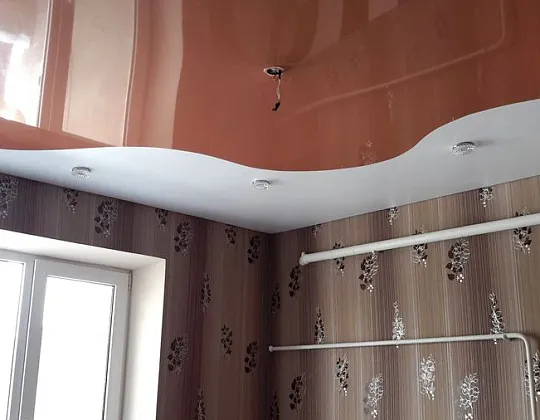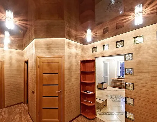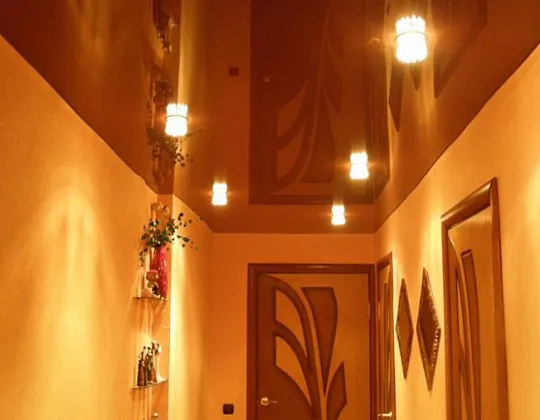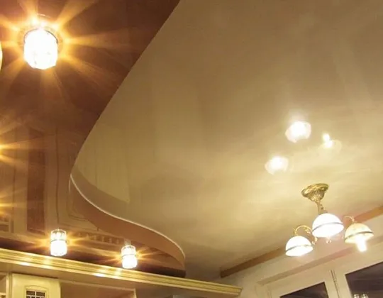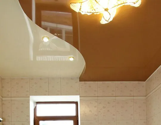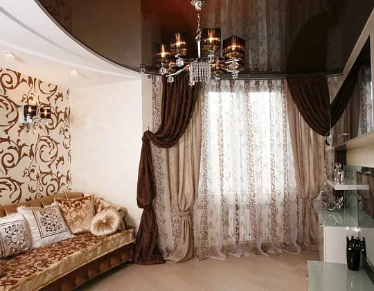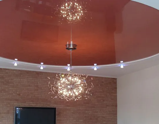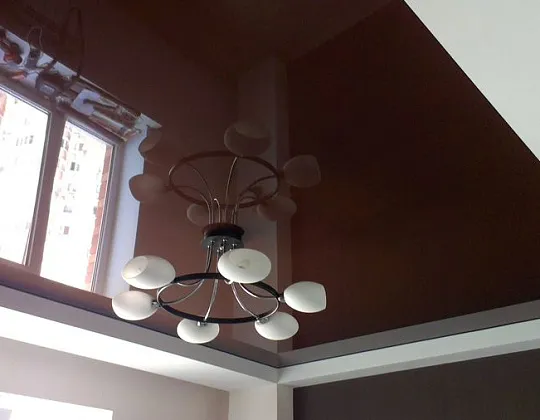 Гостиная, выдержанная в светлых бежевых или песочных тонах и зеркально гладкий потолок цвета шоколада. Современный и стильный офис, уютное респектабельное кафе с деревянной барной стойкой – натяжные потолки коричневые глянцевые будут гармонично и естественно смотреться в любом типе помещений.