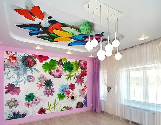 В каталог вошли 3Д изображения всех цветов и размеров. Здесь вы можете найти подходящий рисунок. Это могут быть бабочки, которые сидят на цветах, ветках, порхают в воздухе. Их можно расположить как по всему полотну, так и для декорирования угла и вокруг люстры.